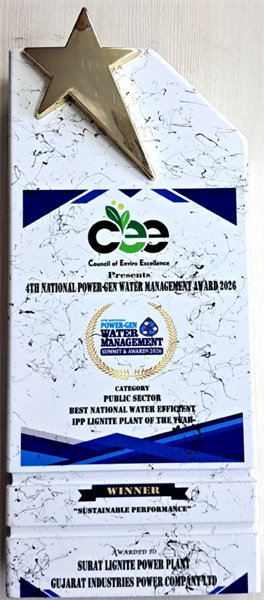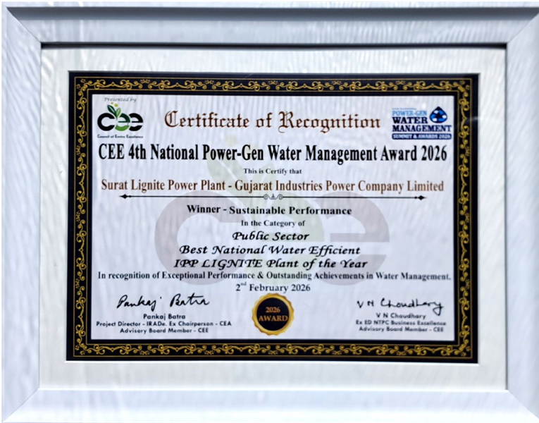 GIPCL-SLPP received "National Power-Gen Water Management Award 2026" under "Public sector Best National Water Efficient IPP Lignite Plant of the year" category, during “4