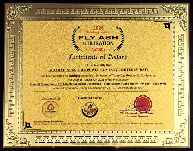 GIPCL - SLPP awarded Winner of “National Fly Ash Utilization Award-2026” for Fly Ash Utilization in Thermal Power Stations in “Overall Champion - Fly Ash Management Excellence IPP 500-1500 MW (State Sector Public Utility)” category, at 15th Fly Ash Utilization Conference-Expo-Awards-2026, Organized by Mission Energy Foundation, supported By Ministry of Coal, Ministry of Power, Ministry of Road Transport and Highways and Ministry of Environment & Forest on 28th February 2026.