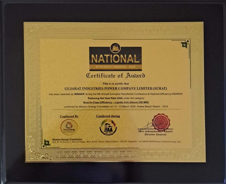 GIPCL-SLPP received “Best-in-Class Efficiency Award” under “Lignite Unit (above 250 MW)” Category, during National Efficiency Awards program organized by Mission Energy foundation on 13